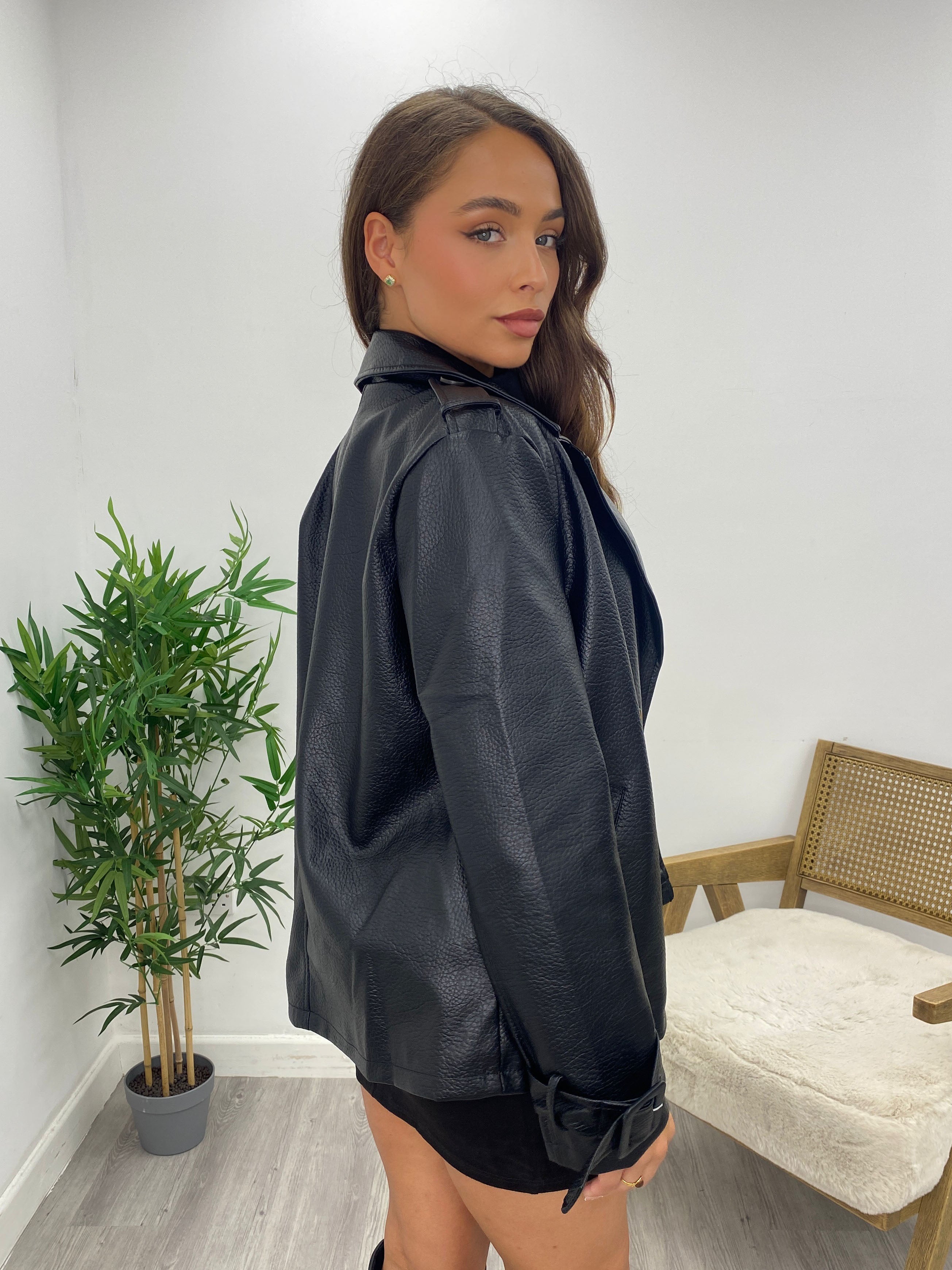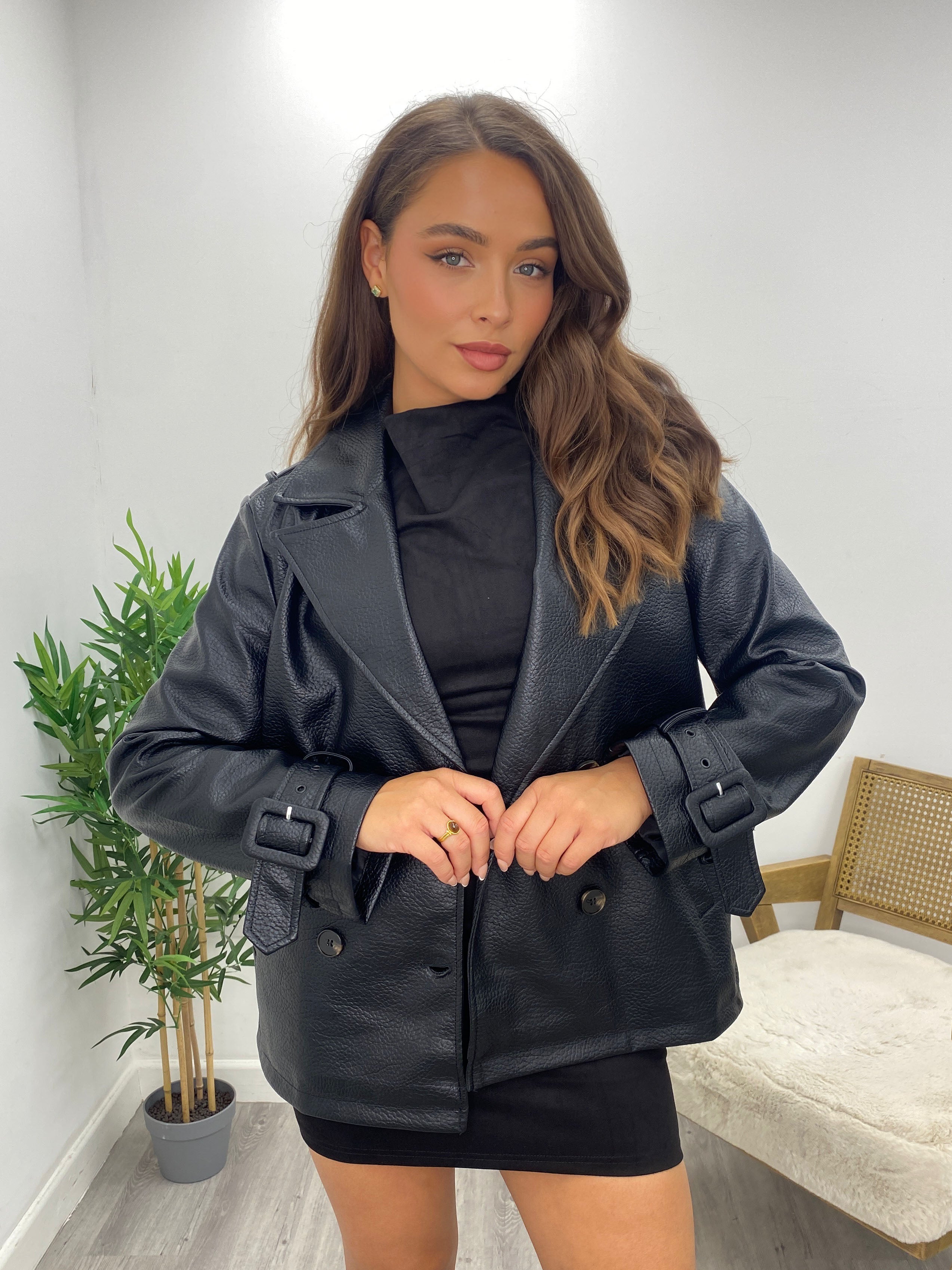 Black Pebble Grain Leather Look Double-Breasted Trench Jacket