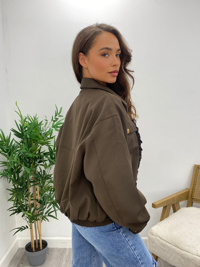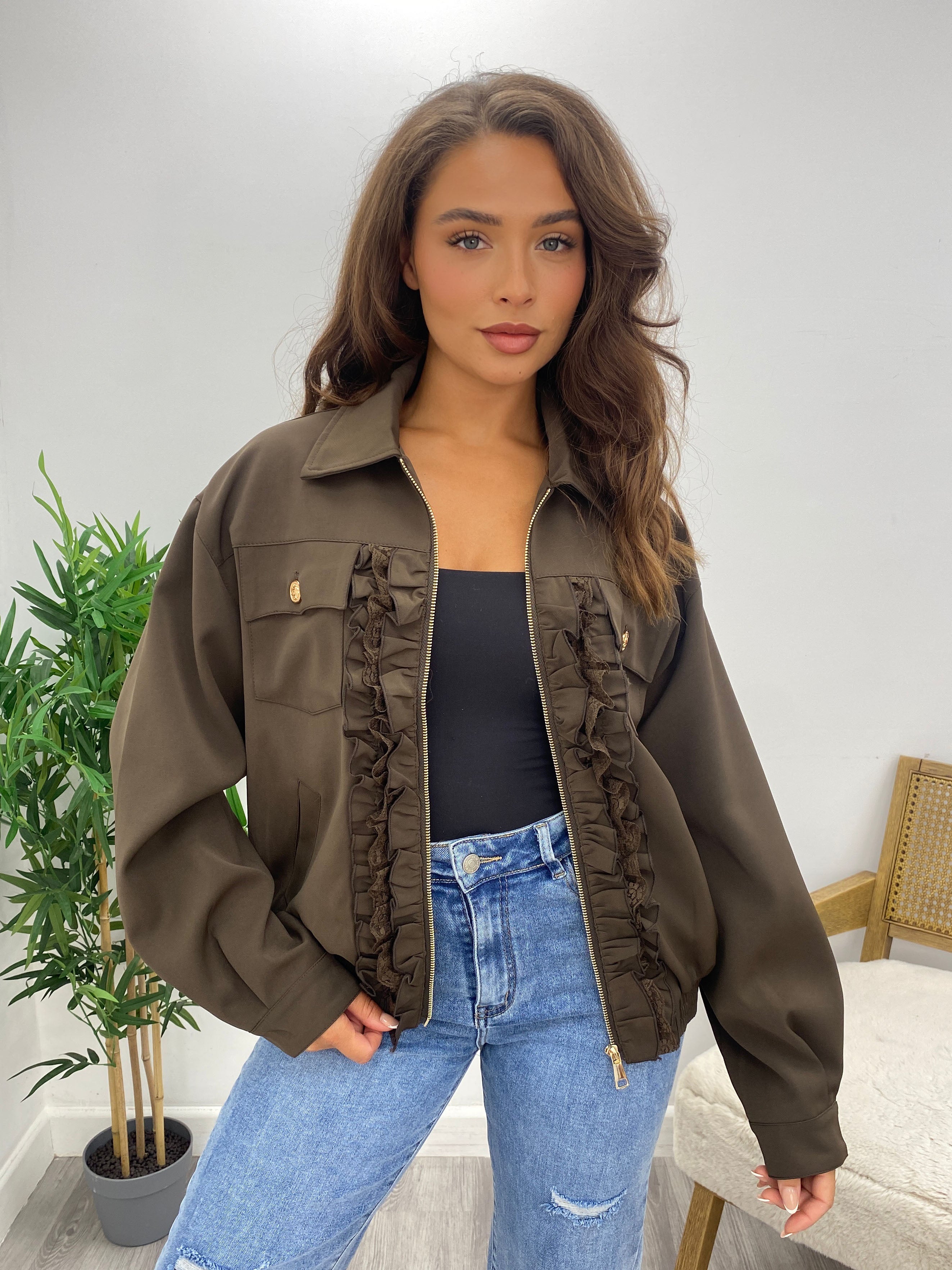 Brown Zip Up Bomber Jacket with Frill Lace Front Detail