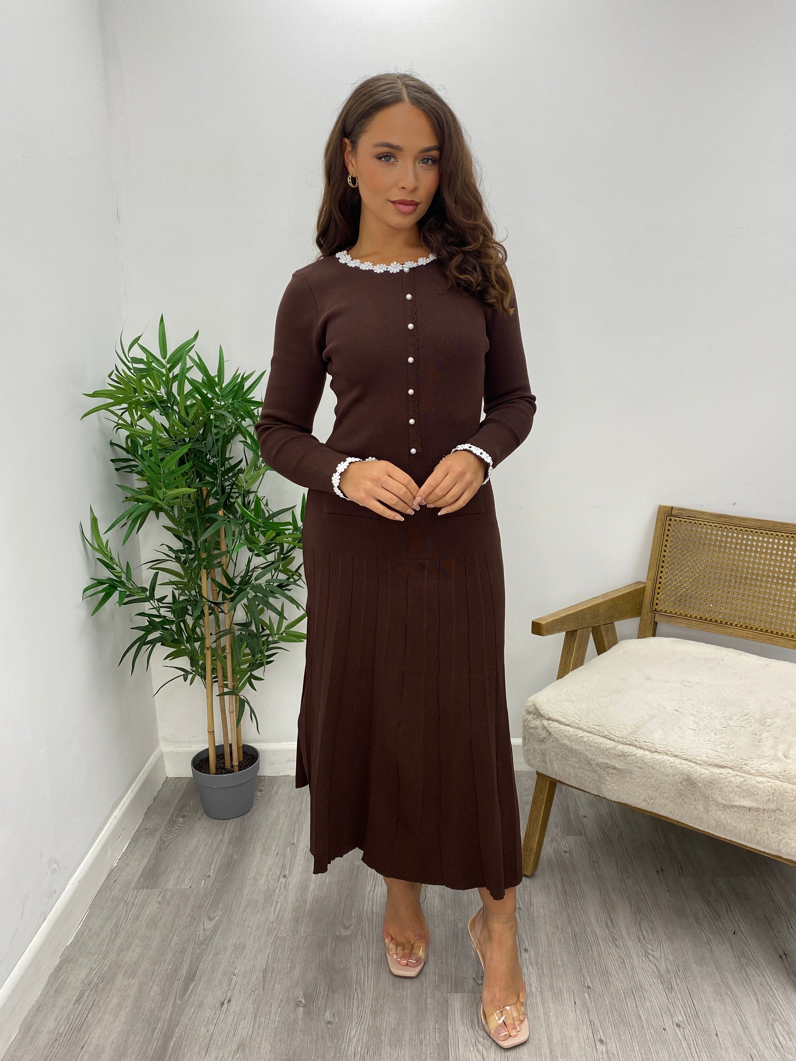 Chocolate Brown Daisy Embellished Midi Knit Dress