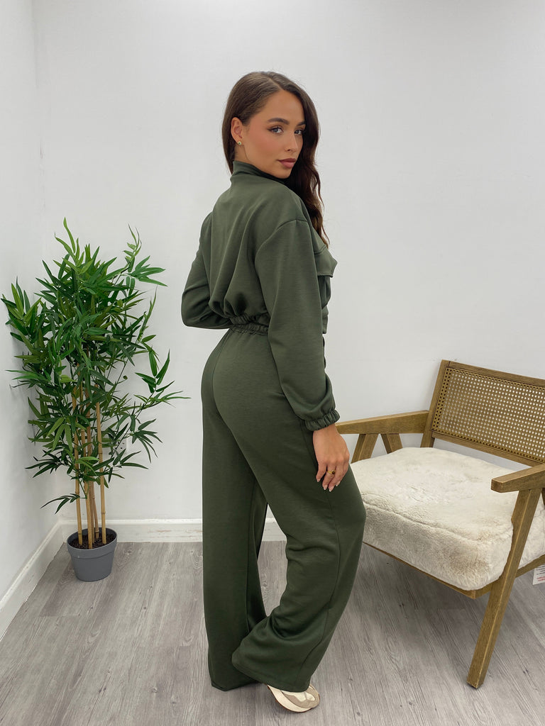 Khaki Premium Scuba Fabric Pocket Detail Cropped Jacket Lounge Set