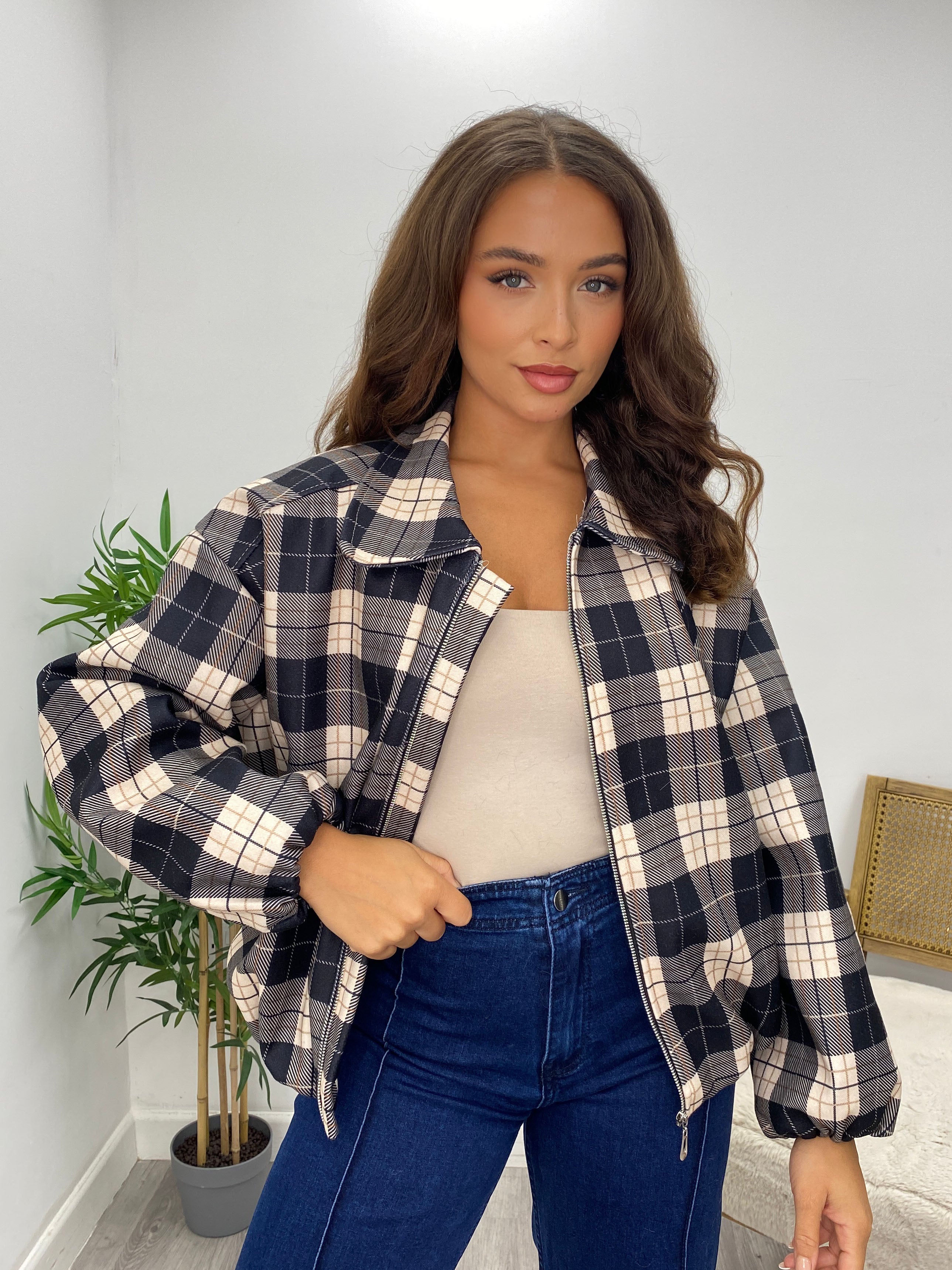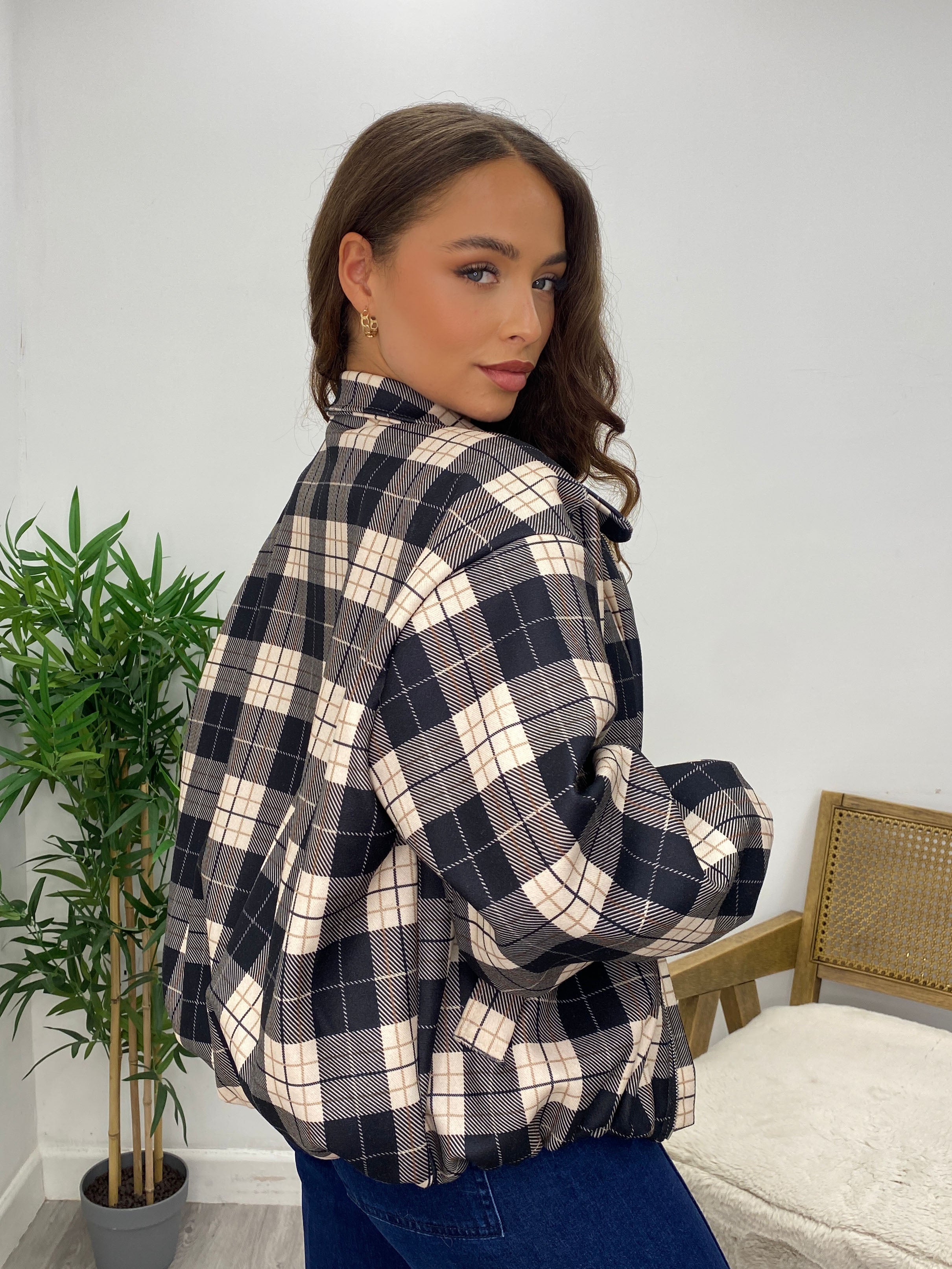 Navy Checked Zip Up Bomber Jacket