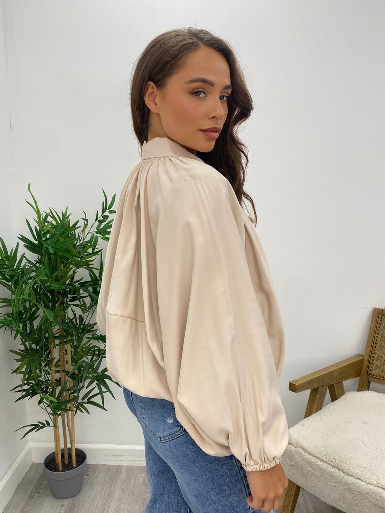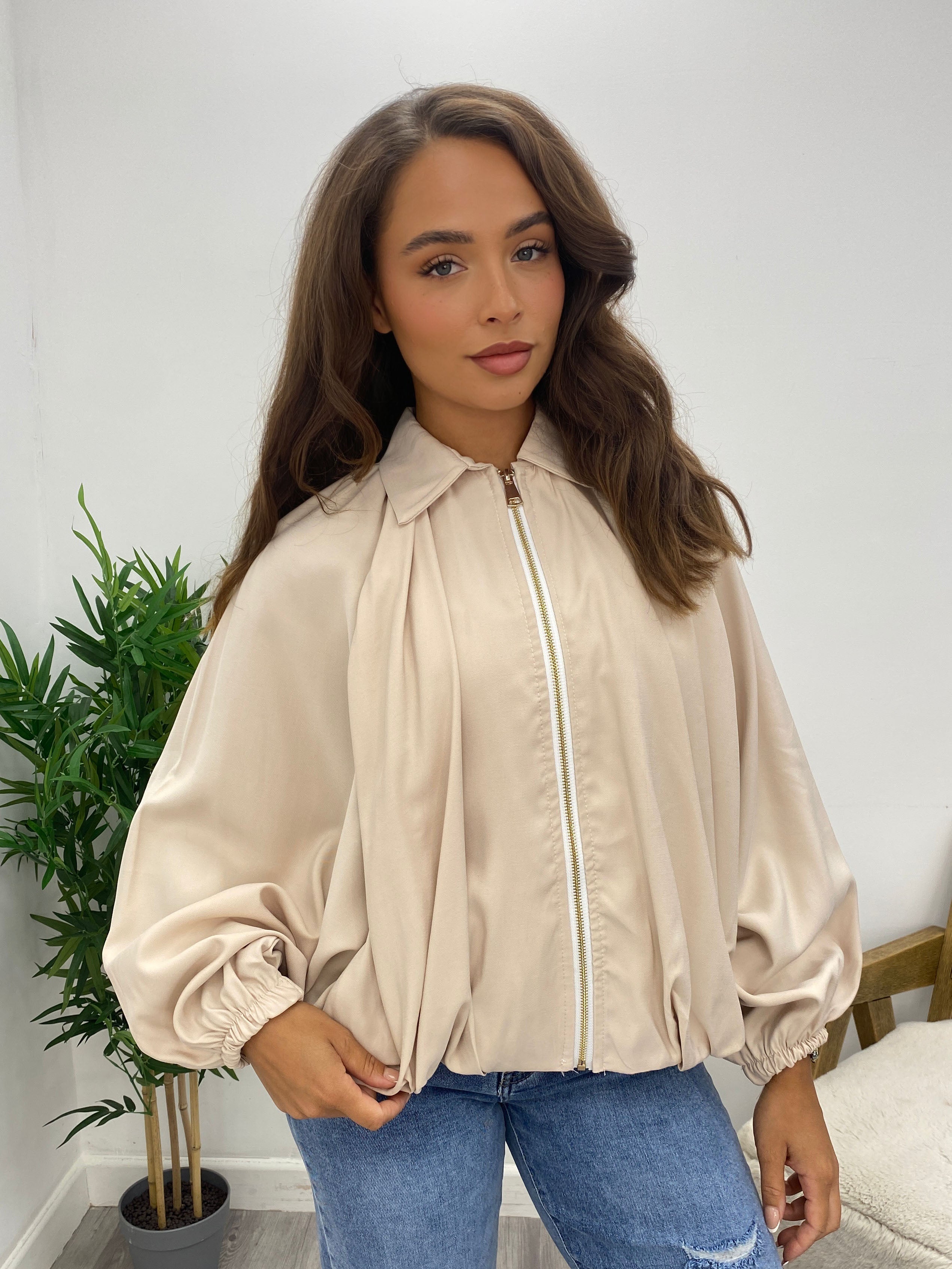 Stand out with our batwing parachute style bomber jacket, the ultimate fusion of streetwear and statement design. Featuring oversized batwing sleeves, a zip-up front, and gathered hem, this lightweight bomber brings effortless volume and a fresh silhouette. Finished in a soft stone shade, it’s perfect for layering across seasons and a must-have for trend-led collections.