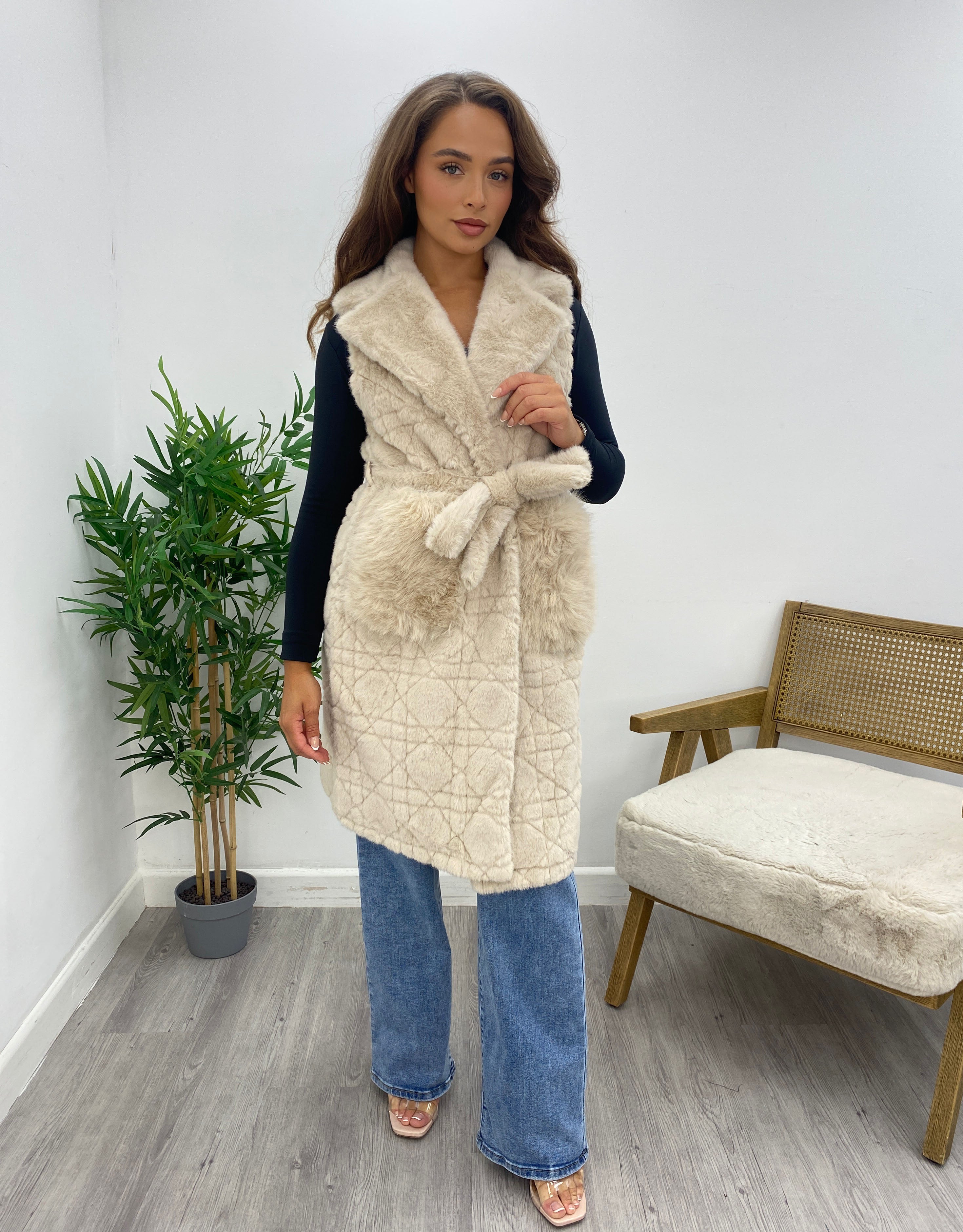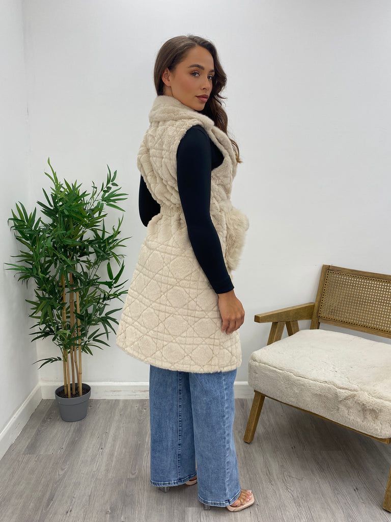 Beige Faux Fur Quilted Gilet Waistcoat with Belt & Pockets