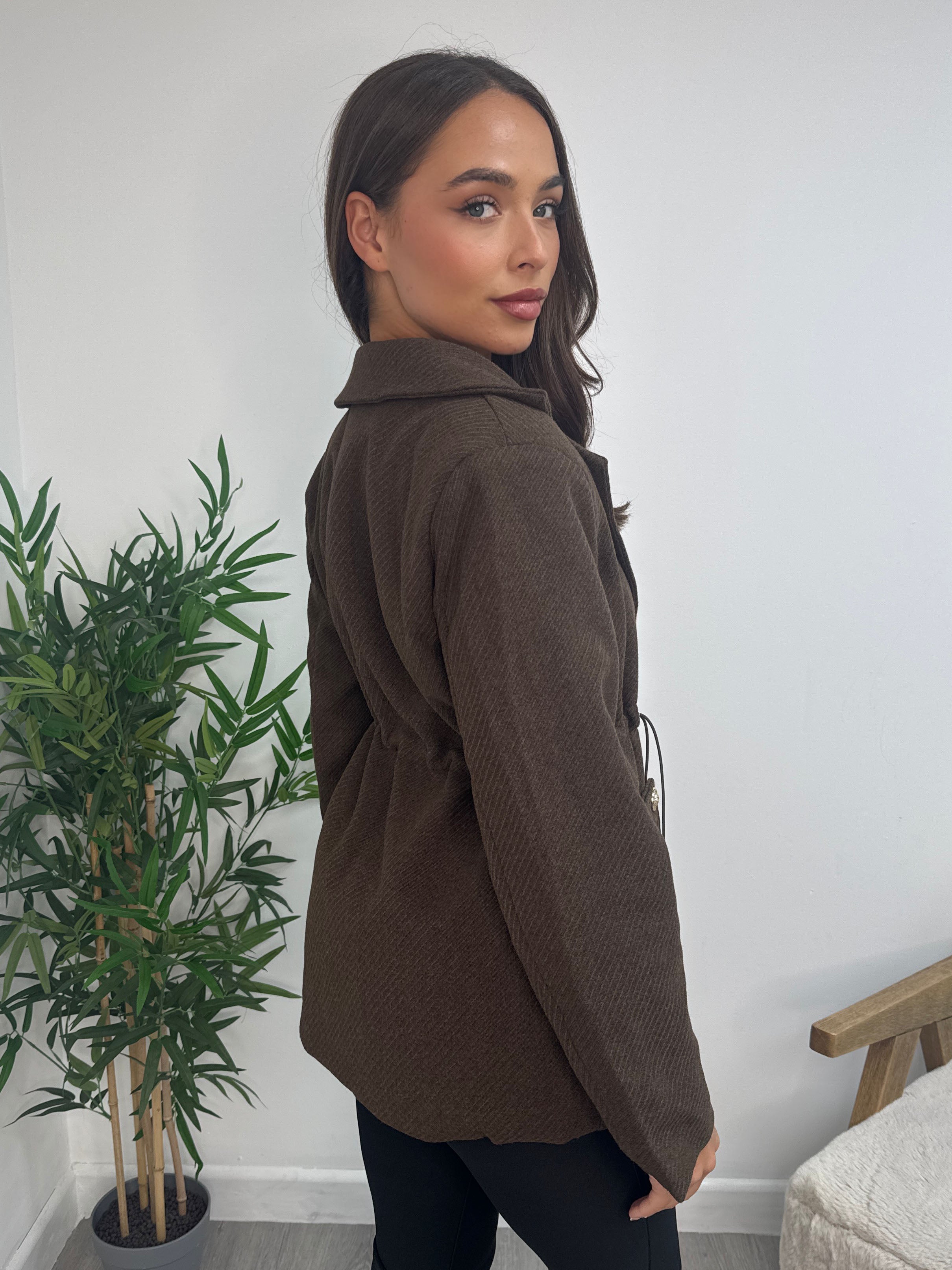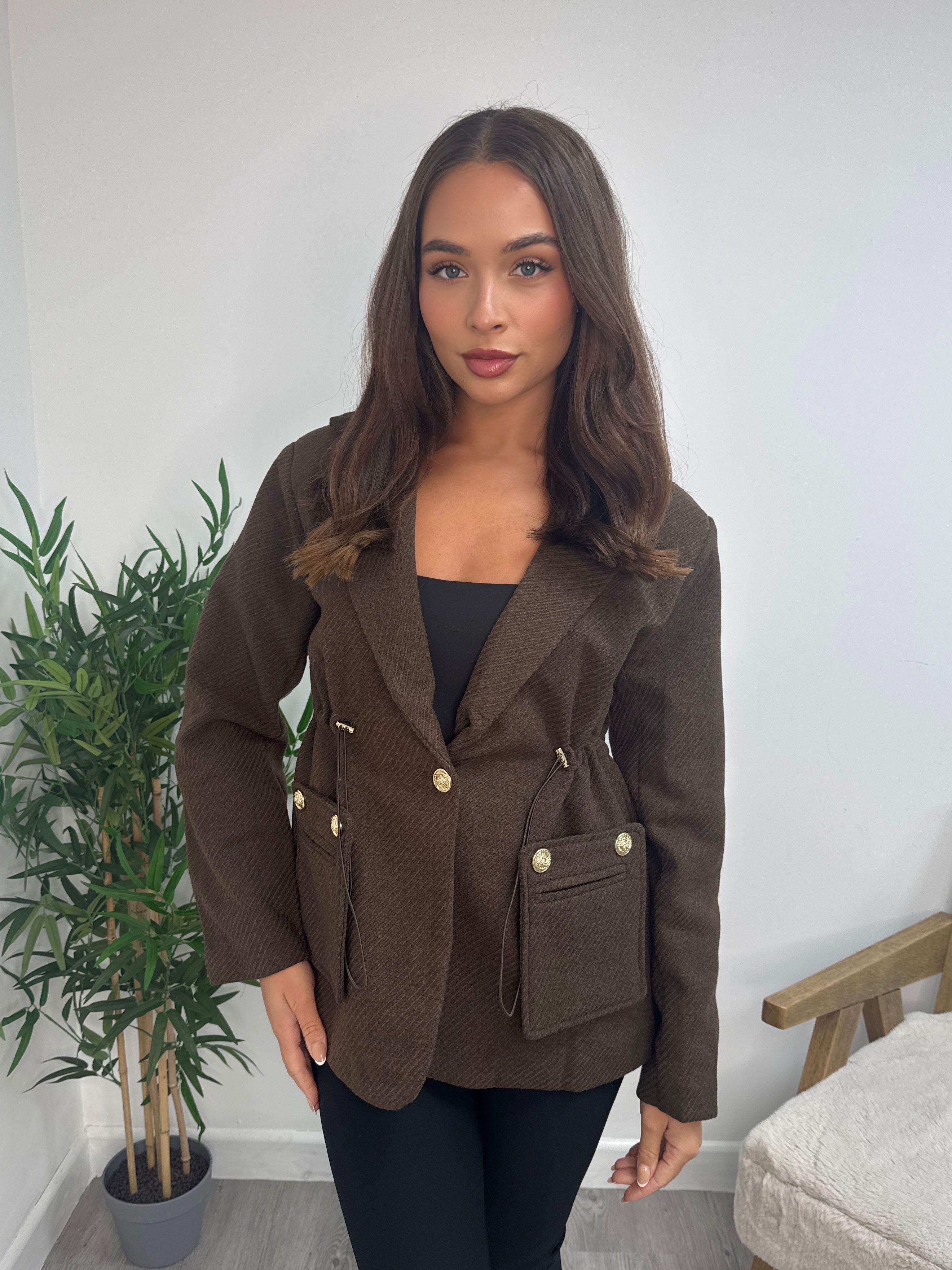 Chocolate Brown Drawstring Waist Blazer with Front Pocket Detail