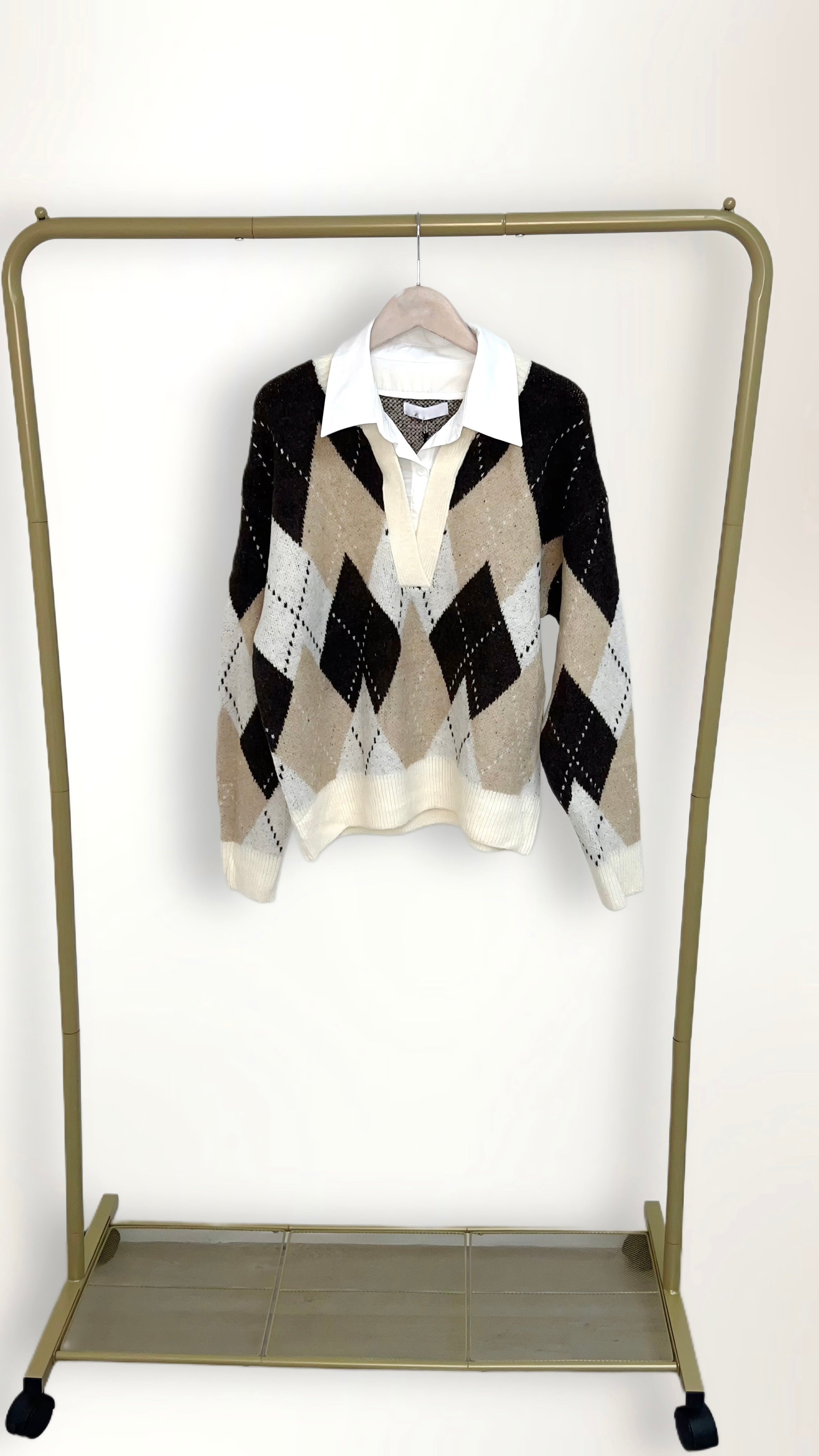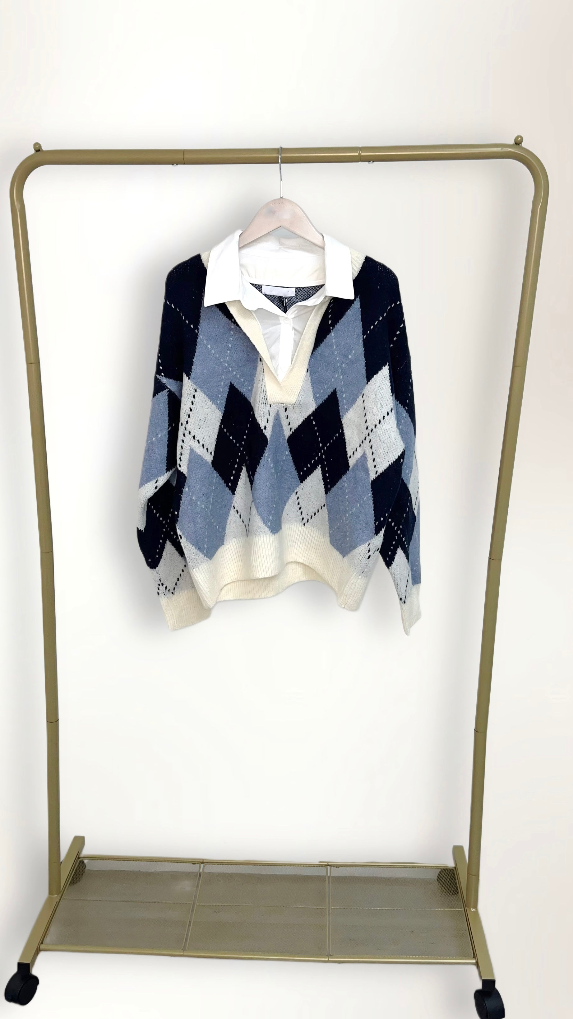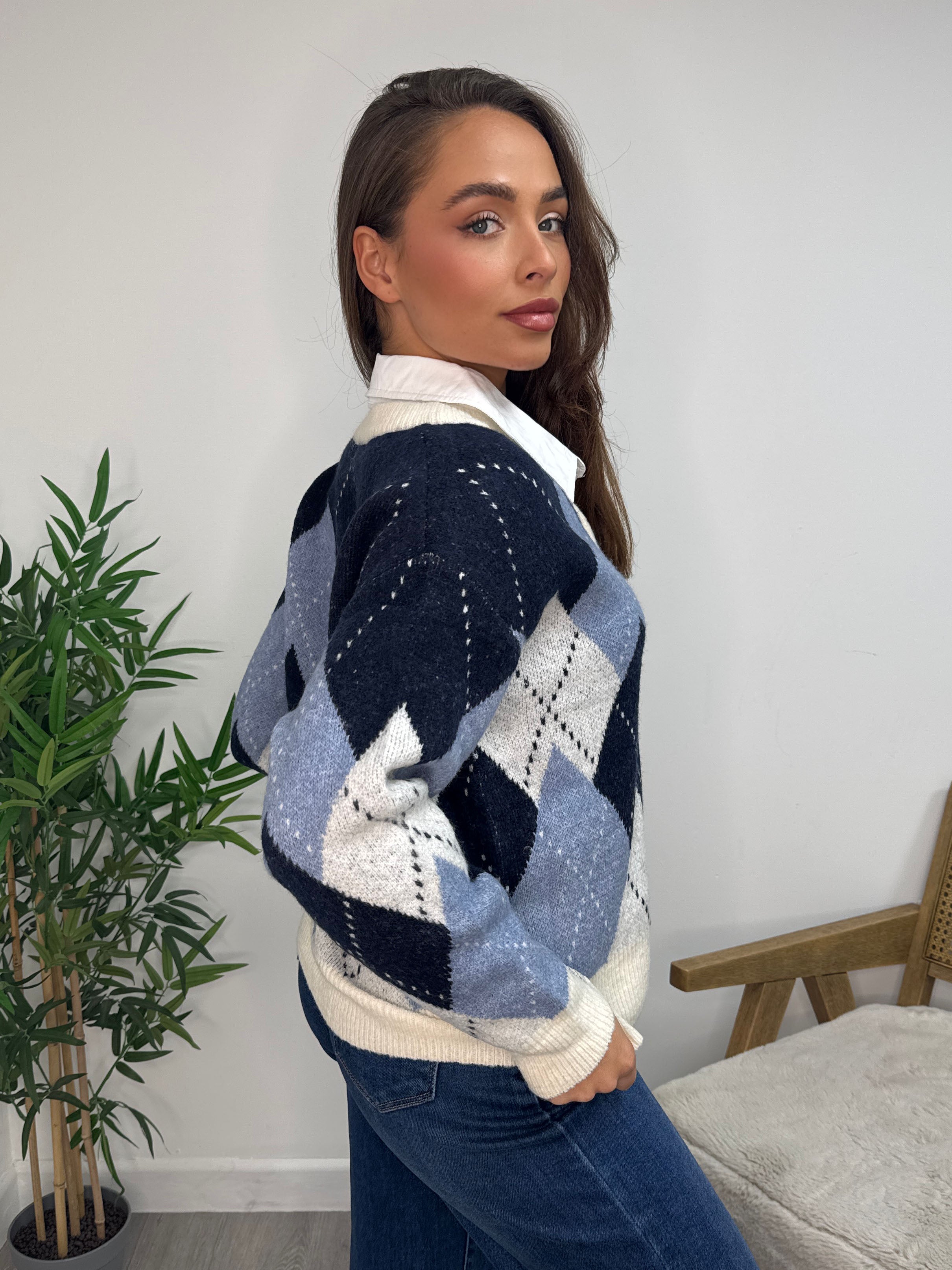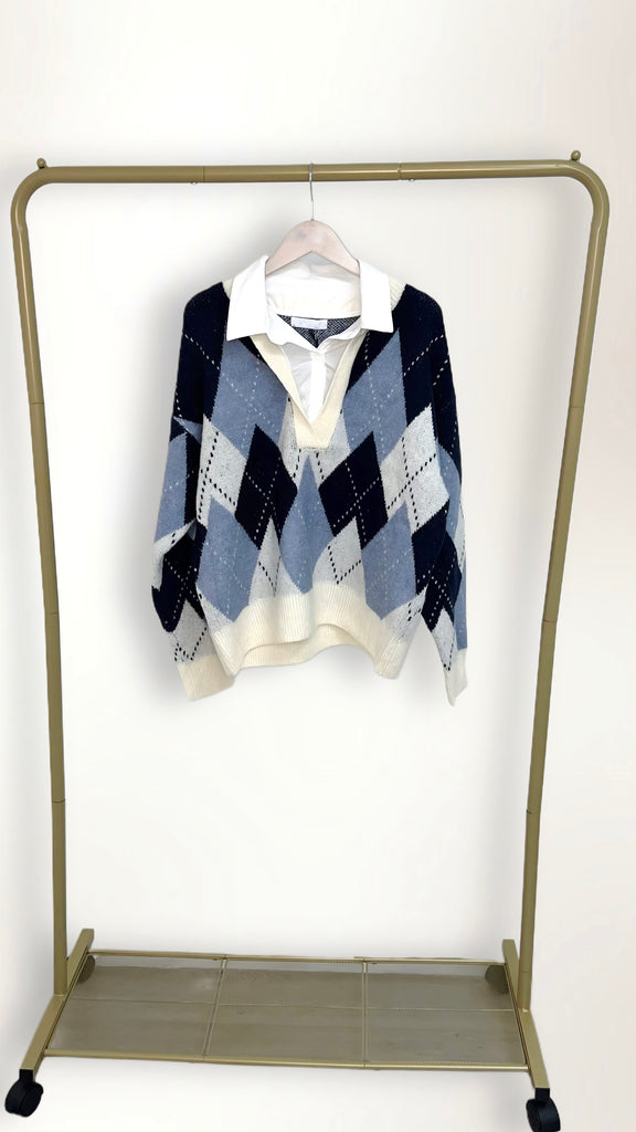 Elevate your knitwear collection this season with our Argyle Knit V-Neck Jumper with Attached Collared Shirt, a pre-styled layered look that blends timeless heritage design with modern ease. This wholesale womens jumper features a classic argyle diamond pattern, a soft knit texture, and a built-in collared shirt insert, delivering a chic, ready-to-wear layered outfit without the bulk. Perfect for boutiques and retail buyers seeking trendy yet versatile knitwear, this jumper transitions seamlessly from workwear to casual styling. Available in neutral beige tones and cool blue hues, it’s a bestselling piece for AW25 collections - combining comfort, sophistication, and convenience in one stylish design.