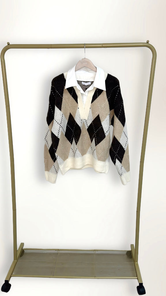 Argyle Knit V-Neck Jumper with Attached Collared Shirt