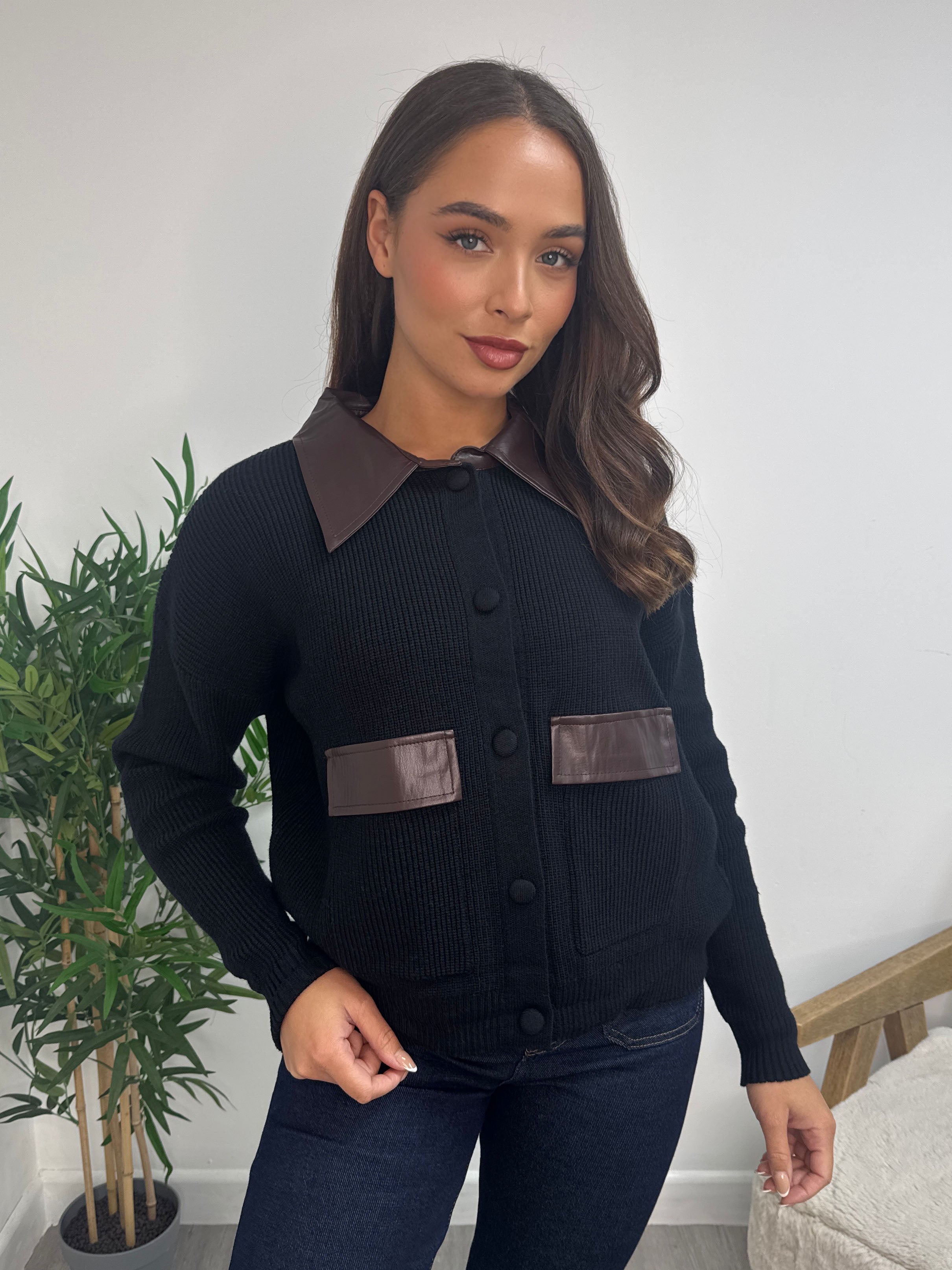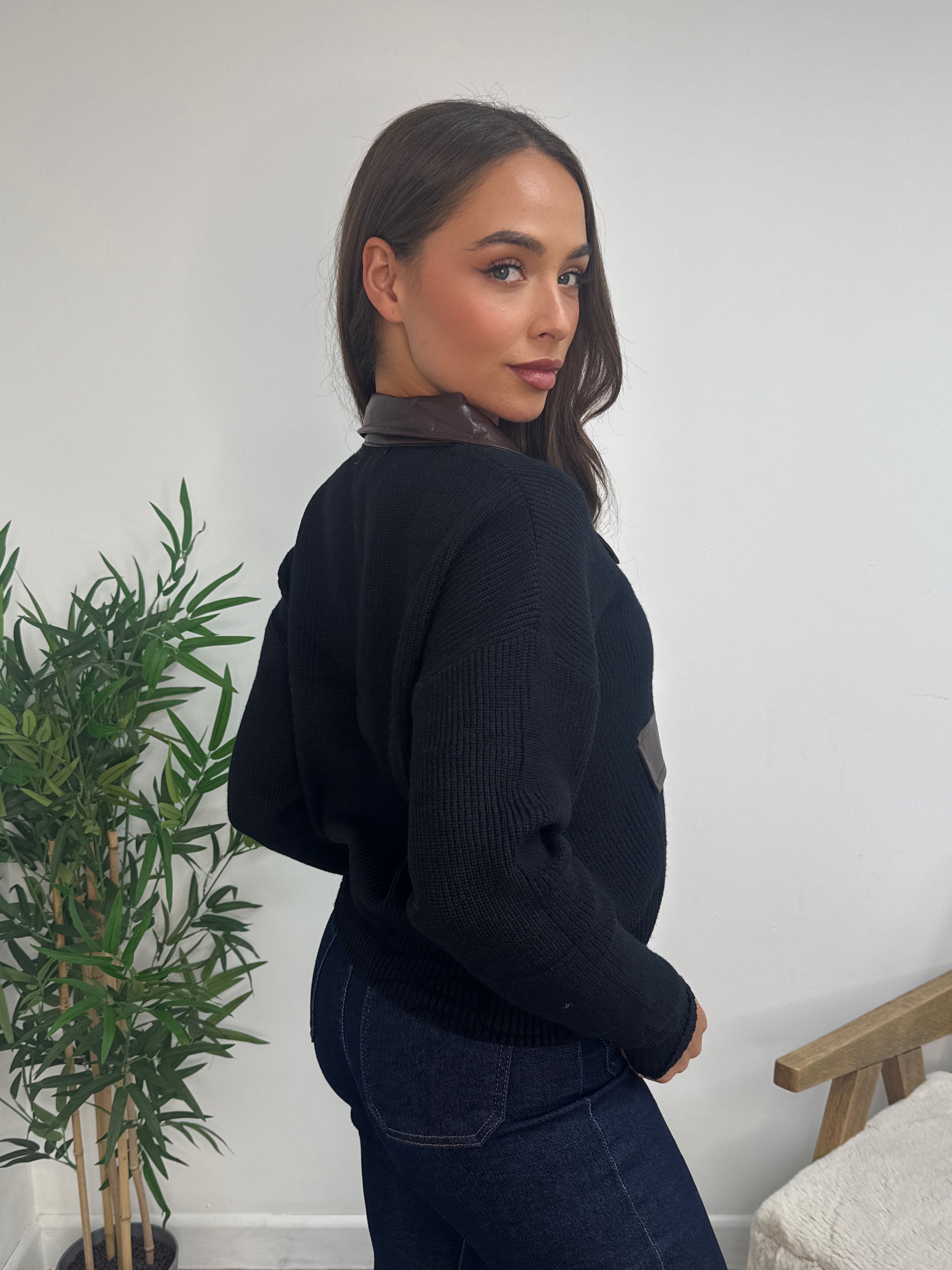 Black PU Trim Button Up Long Sleeve Polo Jumper