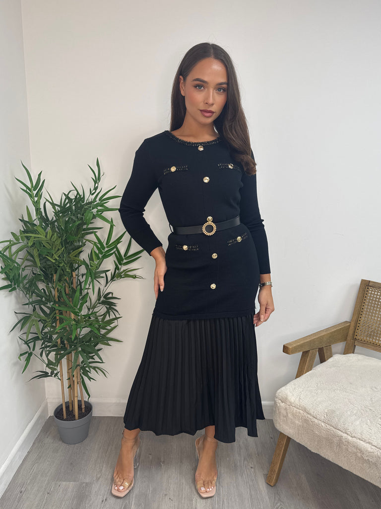 Elevate your wholesale womenswear collection with our Tweed Trim Belted Knitted Long Dress with Pleated Hem a timeless piece that blends elegance with sophistication. This chic midi-length dress features gold-tone button detailing, classic tweed trim accents, and a removable waist belt with a statement buckle for a flattering silhouette. The soft knitted top contrasts beautifully with the flowy pleated hem, creating a graceful, feminine shape perfect for both daywear and special occasions.