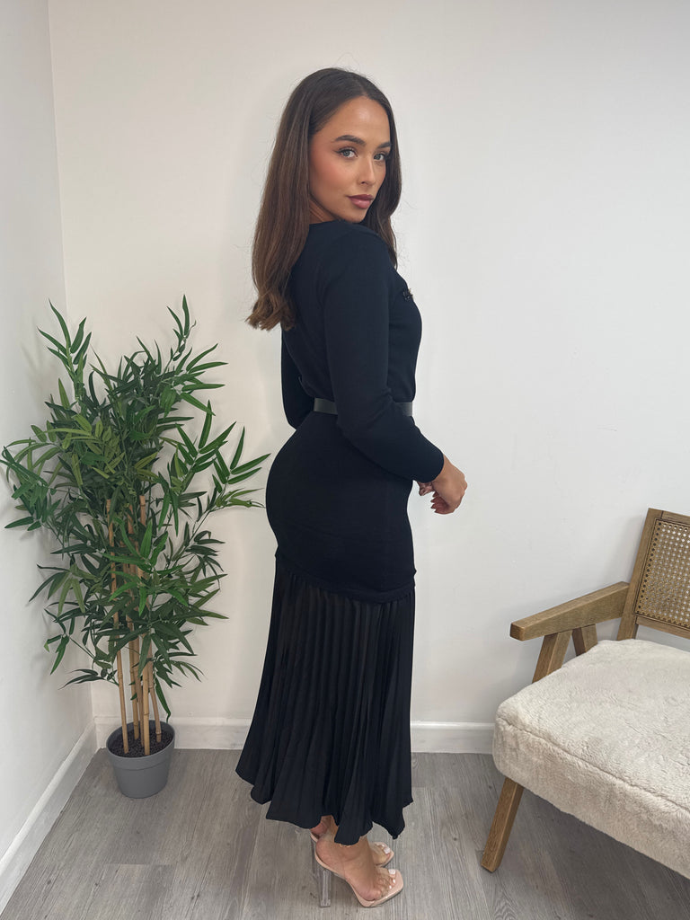 Black Tweed Trim Belted Knitted Long Dress with Pleated Hem