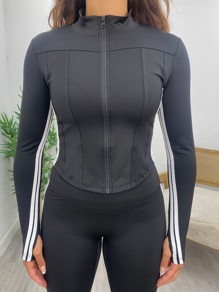 Level up your athleisure collection with our active sculpt two-piece set. Featuring a sleek zip-through sports jacket and matching high-waist flared leggings, both finished with contrast side stripe detail for a sporty edge. Designed in a rich black shade with stretch fabric for a sculpting fit, this co-ord is perfect for gym-to-street styling.