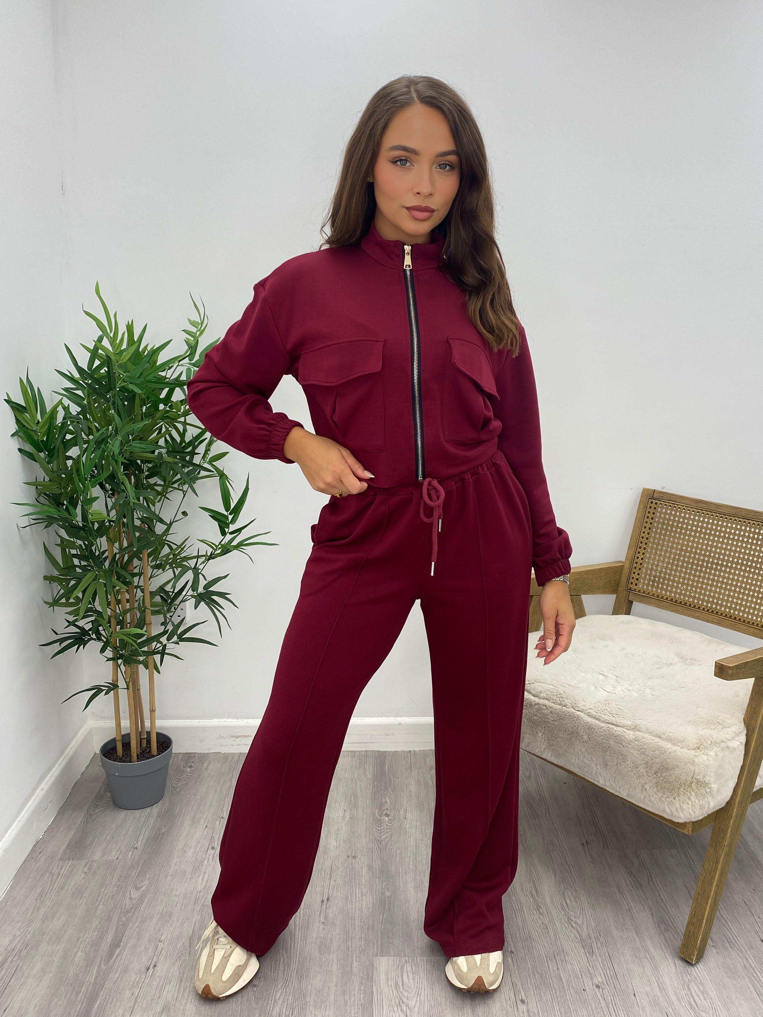 Burgundy Premium Scuba Fabric Pocket Detail Cropped Jacket Lounge Set