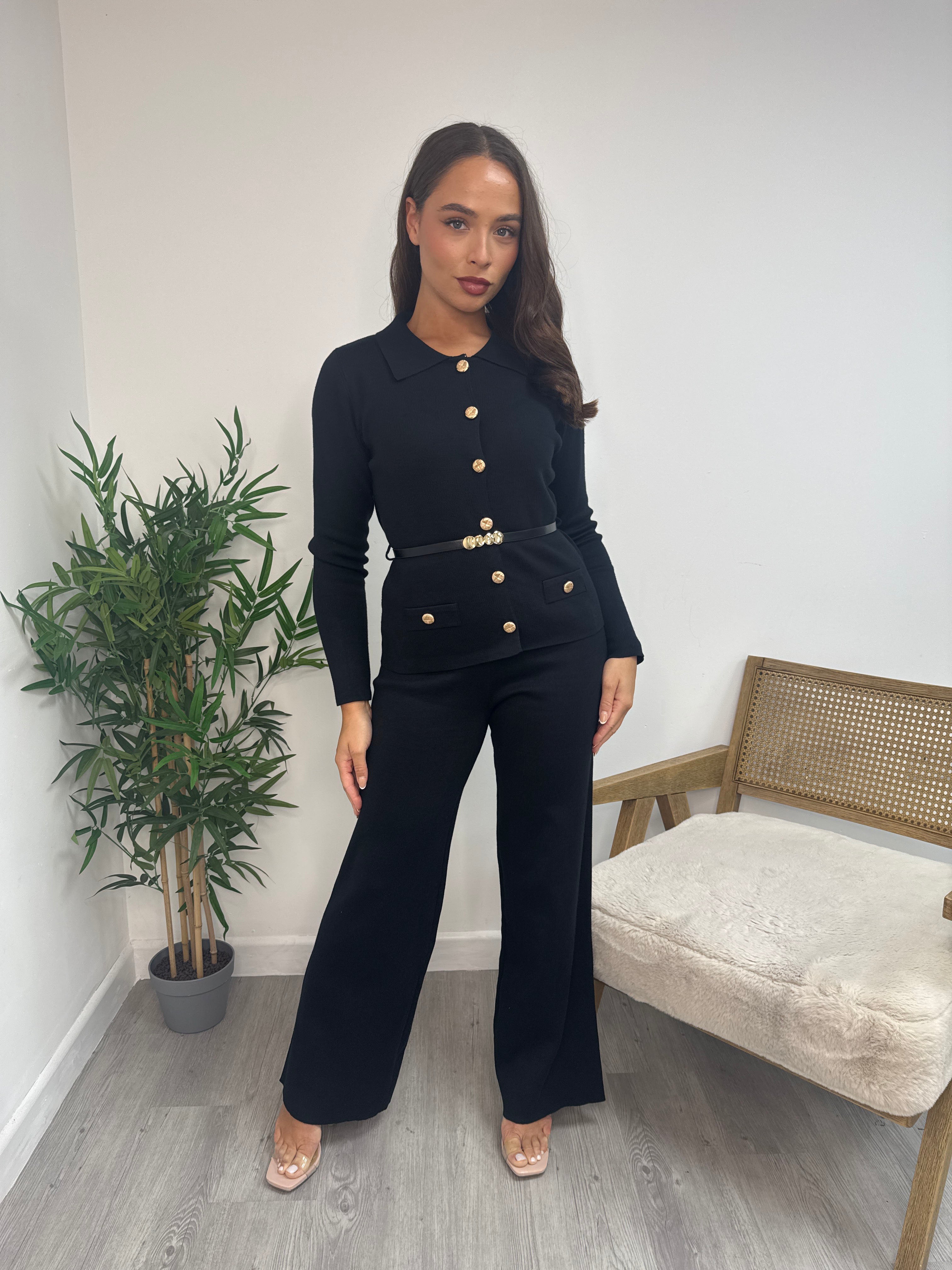 Black Button Up Polo Belted Wide Leg Co-Ord Set