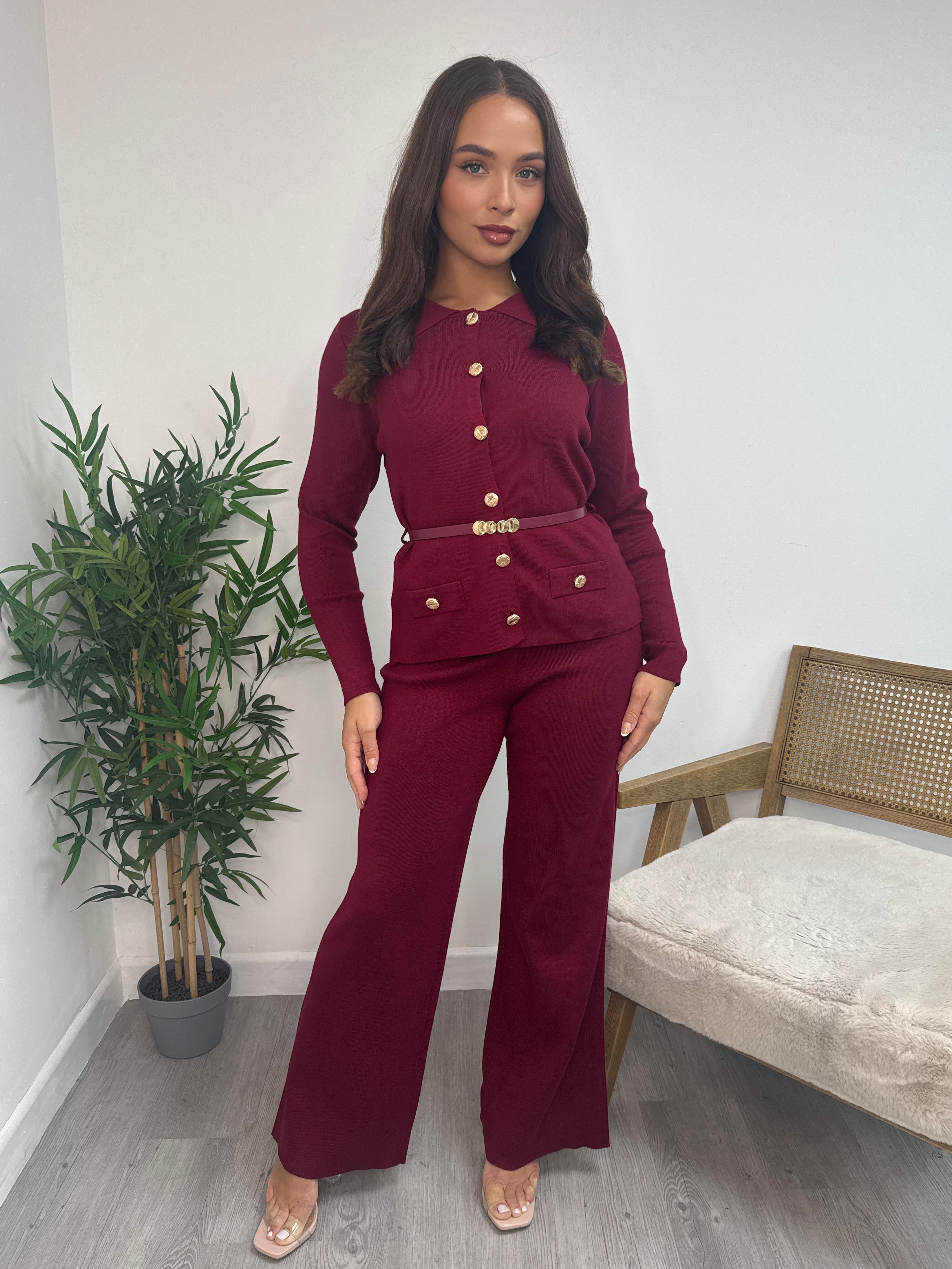Burgundy Button Up Polo Belted Wide Leg Co-Ord Set