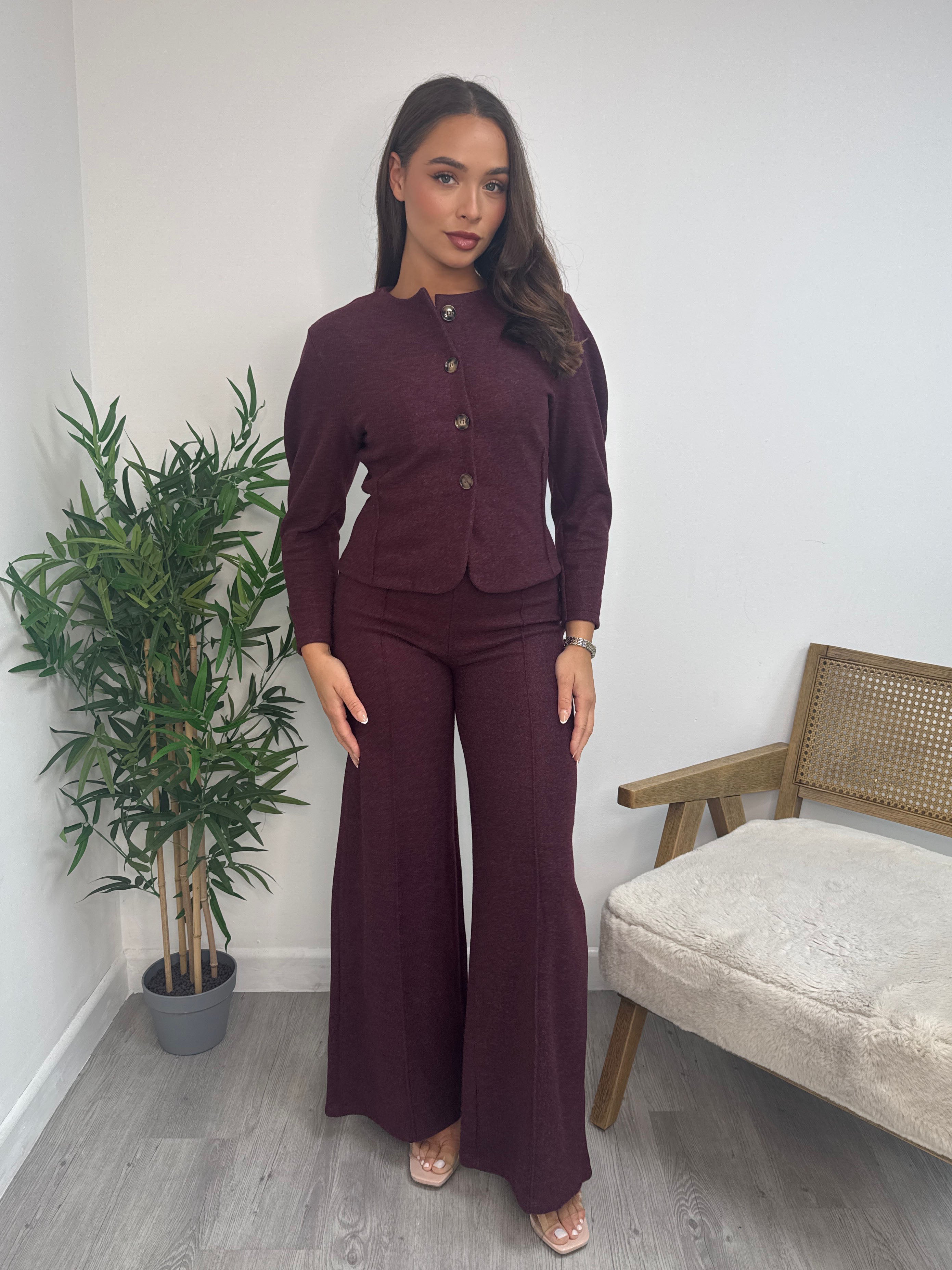 Deep Burgundy Button Up Structured Cardigan & Pleated Wide Leg Trouser Co-Ord Set