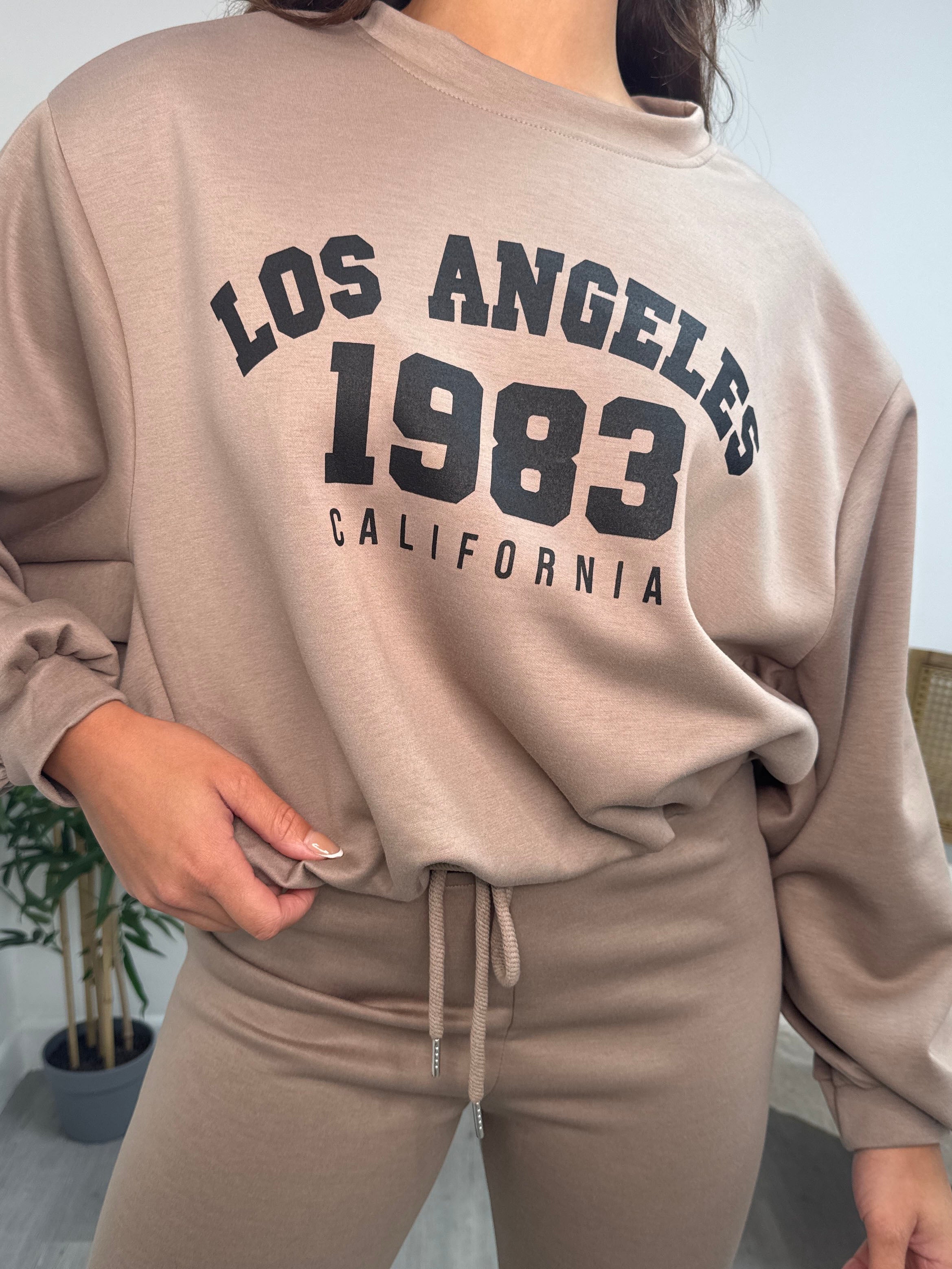 Taupe Los Angeles 1983 Elasticated Hem Sweatshirt & Flared Bottom Lounge Set