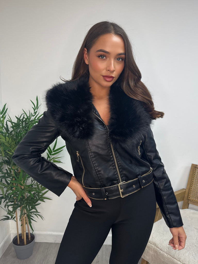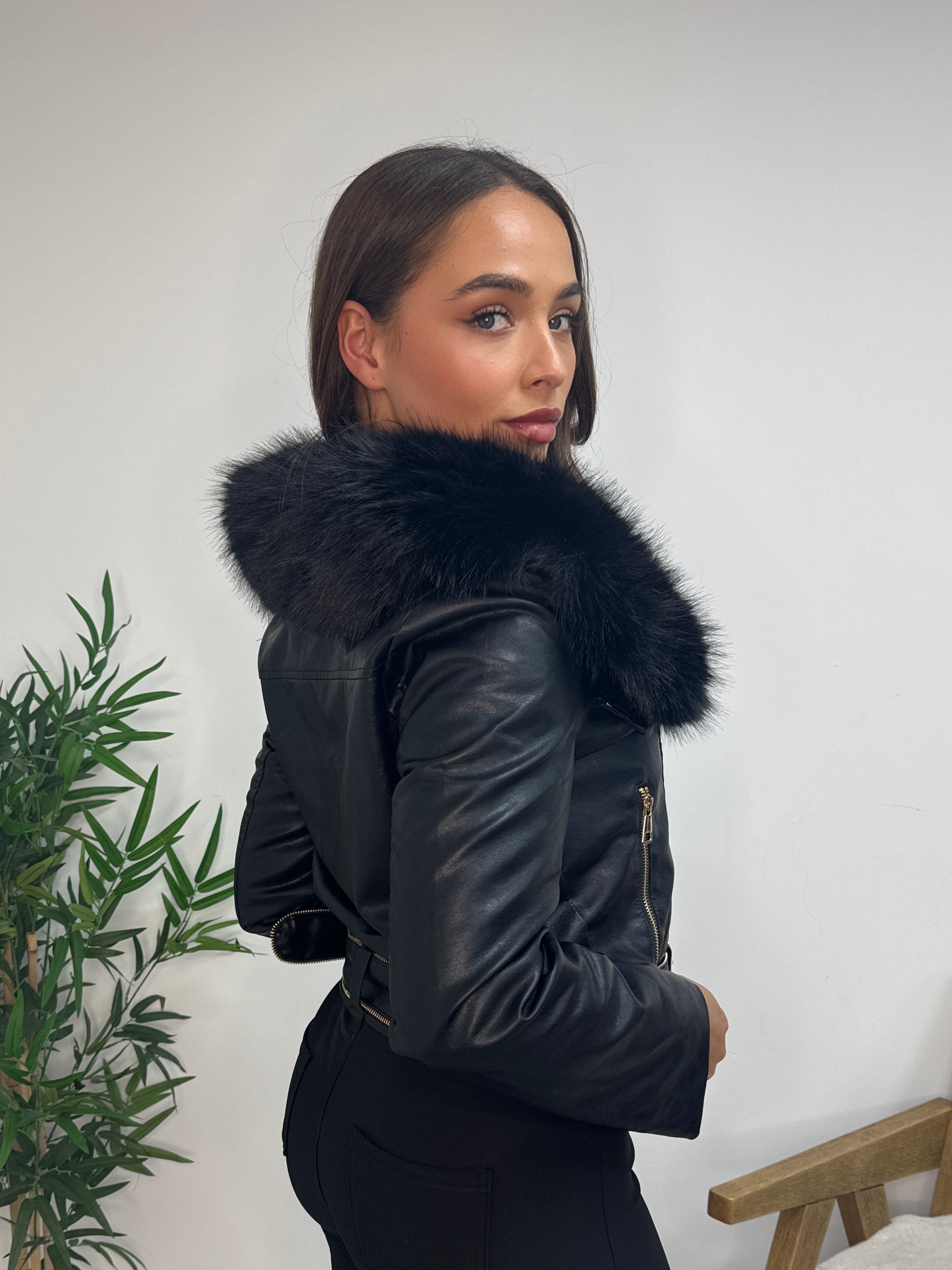 Black Faux Fur Lapel Biker Jacket with Zip Trim Detail & Faux Fur Lining